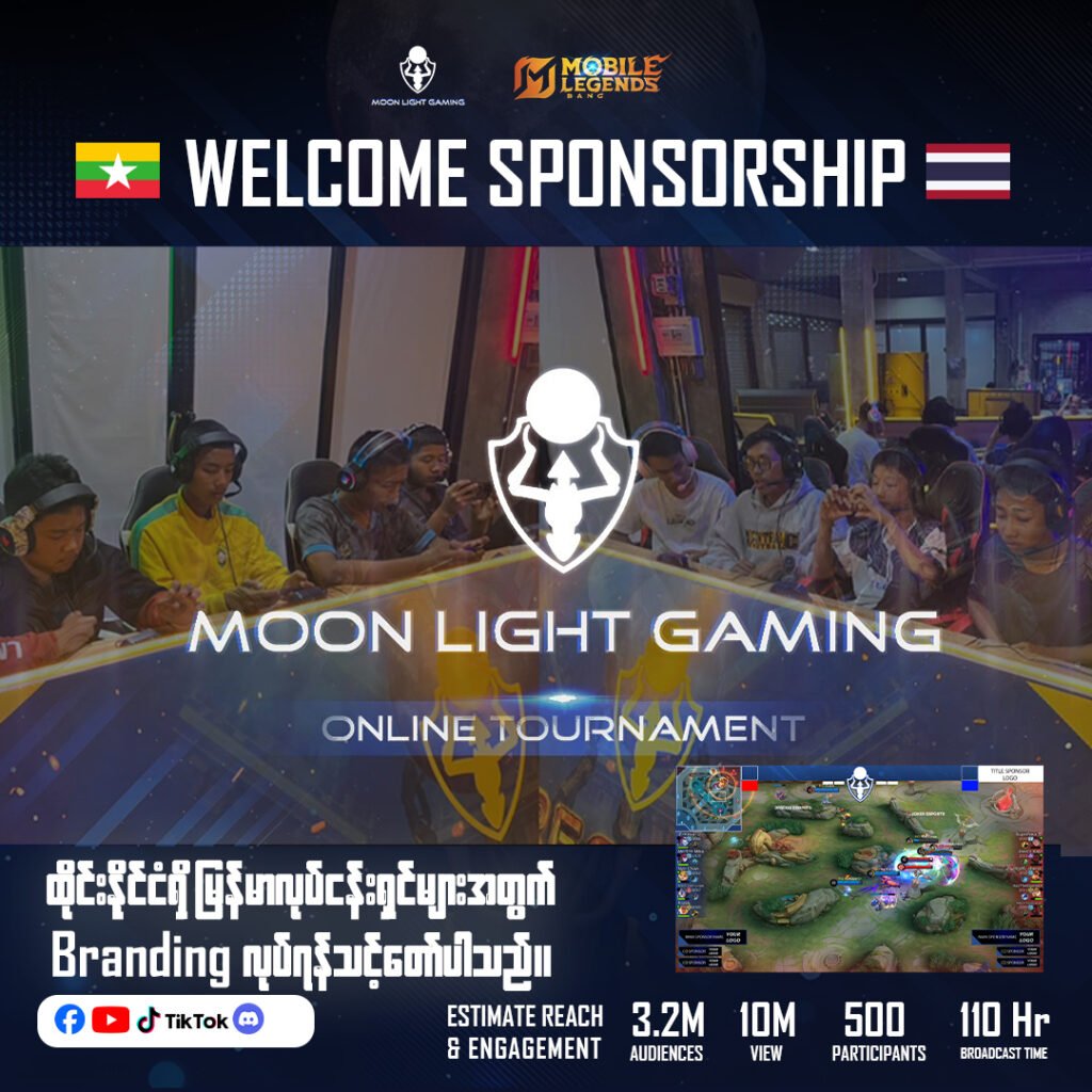 ထိုင်းရောက် မြန်မာလုပ်ငန်းရှင်တွေ ကိုယ့်လုပ်ငန်းအတွက် Digital Branding လုပ်နိုင်မယ့် Sponsorship Program လေးတစ်ခုနဲ့ မိတ်ဆက် ပေးချင်ပါတယ်။ ကျွန်တော်တို့ Moon Light Gaming Thailand ဟာဆိုရင် လူငယ်တွေကြားမှာ ခေတ်စားနေတဲ့ E-Sport game ပြိုင်ပွဲတွေကို ထိုင်းနိုင်ငံအတွင်း Online/Offline ကျင်းပနေတဲ့ အဖွဲ့အစည်းတစ်ခုပဲဖြစ်ပါတယ်။ မကြာခင်ကပဲ The Real Heroes Season 1 MLBB Offline Tournament လေးကတော့ အောင်မြင်စွာ ကျင်းပပြီးစီးလို့သွားခဲ့ပါပြီခင်ဗျာ။ အခုတစ်ခါမှာတော့ Moon Light Online Tournament ကို October 2025 မှာစတင်ကျင်းပတော့မှာ ဖြစ်တဲ့အတွက် လူကြီးမင်းတို့ရဲ့ လုပ်ငန်းအား Digital Branding လုပ်နိုင်ဖို့ ကျွန်တော်တို့နှင့်အတူ လက်တွဲဖို့ ဖိတ်ခေါ်အပ်ပါတယ်ခင်ဗျာ။